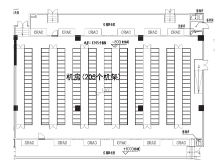 机房共规划安装11列设备,每列设1个列头柜,组成6个封闭冷通道,共可安装205个IT机柜,如图3所示。