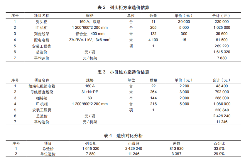 根据上述典型机房模型,采用列头柜方案将比小母线方案减少11个机柜。相关建设成本估算如表2、3、4所示。