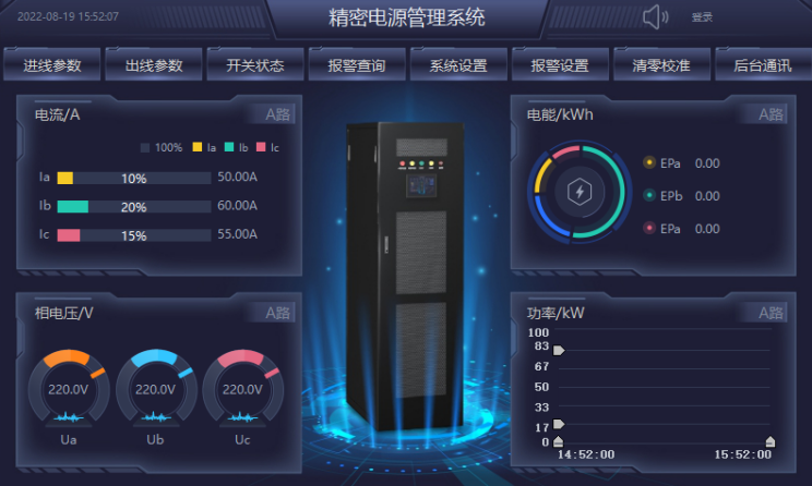 监测主路的三相电压、电流、系统频率;各项及总的有功功率,无功功率,视在功率,功率因数,有功电能、无功电能;电流、电压不平衡度;电流、电压谐波含量;*大需量。