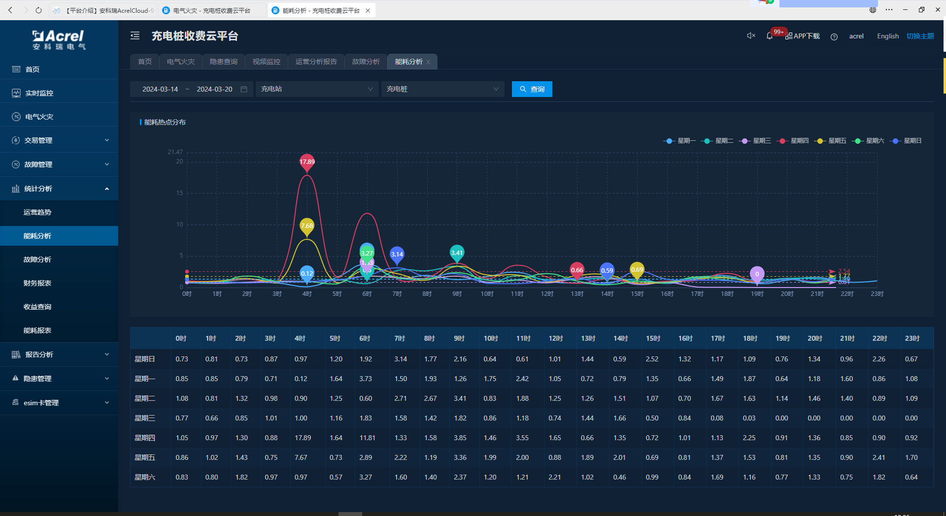 在能耗分析中,可查看*定时段关联站点和关联桩的能耗信息并显示对应的能耗趋势图。如图所示: